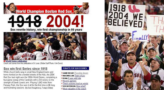 Al año siguiente, los Yankees se cruzarían en el camino de los Red Sox una vez más. En un partido de la temporada regular incluso ambas escuadras se enzarzaron en una pelea. El destino parecía escrito y ambos equipos se volverían a ver las caras en las series de campeonato de la Liga Americana. Las series comenzaron de manera desastrosa para los intereses de los Red Sox ya que perdían los tres primeros juegos. Los aficionados creían que, una vez más, este no sería el año en el que se rompiese la maldición. Nunca antes un equipo había dado la vuelta a un marcador adverso de tres partidos a cero. En el cuarto juego, los Yankees vencían 4 carreras a 3 en la novena entrada y parecía que la serie llegaba a su fin cuando Bill Mueller conectó un hit que aportó la carrera del empate forzando la prórroga. En ella, David Ortiz conectaba un home-run en la décimosegunda entrada para ganar el partido. Los Red Sox seguían con vida. En el quinto juego la historia tomaba un guion parecido y, tras venir de atrás, los Red Sox forzaban la prórroga y vencían en la misma con un hit de David Ortiz en la decimocuarta entrada. Los Red Sox se harían también con la victoria en el sexto partido y forzarían el séptimo y definitivo. Este juego no podía escapársele de las manos a los Red Sox y con la motivación en alza luego de venir de atrás en la serie, arrasaron a los Yankees con un marcador final de 10 carreras a 3, y calificándose para sus quintas series mundiales desde la venta de Babe Ruth. Pero esta vez, no pensaban bajo ningún motivo, volver a fracasar en el intento. Además, el rival era un viejo conocido, que ya les había ganado en dos Series Mundiales y en el séptimo partido, los St. Louis Cardinals. El primer partido fue muy reñido y aunque los Red Sox se pusieron por delante por un marcador de 7 carreras a 2, los Cardinals supieron remontar para empatar el partido por dos veces, hasta que finalmente Mark Bellhorn dio la ventaja final para los Red Sox y consiguieron ganar el partido. El siguiente partido también lo ganaron los Red Sox y la serie viajó a San Luis, aunque esta vez tocaba el turno de lanzar a Pedro Martínez. Martínez no permitió una sola carrera en las siete primeras entradas y los Red Sox ganaban tres carreras a cero. El marcador final fue de cuatro carreras a una. El 27 de Octubre de 2004 Keith Foulke lanzaba la pelota a primera base para convertir el último out del cuarto juego con el marcador de tres carreras a cero a favor de los Boston Red Sox, logrando ganar las Series Mundiales y llevando el júbilo a los aficionados de Boston que veían como después de 86 años se proclamaban campeones de la MLB. Algo que la gran mayoría nunca había visto en su vida. El MVP de las series fue Manny Ramírez. El momento había llegado. Por fin se conseguía lo muchas veces ansiado. Se rompía la maldición de Babe Ruth.