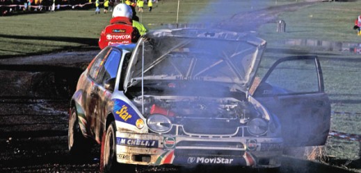¡Trata de arrancarlo Carlos! ¡Trata de arrancarlo por Dios! Luis Moya se deja la garganta gritando a su compañero Carlos Sainz mientras mira con desesperación el motor humeante del Toyota Corolla WRC que les acaba de dejar tirados a 500 metros de la meta. Una imagen que está a punto de dar la vuelta al mundo y nos encogió el corazón a todos los aficionados de los rallies. Es poco menos que increíble lo que acaba de suceder. Se ha esfumado el Mundial de la forma más cruel que uno se puede imaginar.
