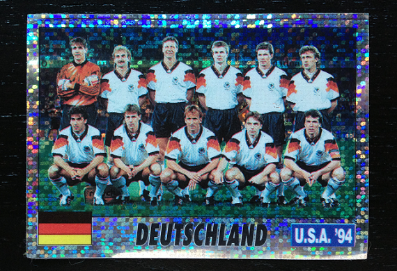 Forman abajo también jugadores de bastante nivel. Empezando por la izquierda Karl-Heinz Riedle delantero del Lazio que ese mismo verano sería el artífice del pase a la final de la Eurocopa al conseguir dos goles en semifinales frente a la anfitriona Suecia. Sus mejores años llegarían después en el Borussia Dortmund en donde ganaría la Bundesliga y la Champions League con otros dos goles suyos. A su lado, Manfred Binz, defensa del Eintracht de Frankfurt durante buena parte de su carrera deportiva. Después de la Eurocopa del 92 no volvió a ser convocado. El siguiente es Andreas Brehme, uno de los mejores defensas que ha dado Alemania en la década de los 80 y 90. En España le conocemos principalmente por su fugaz paso por el Real Zaragoza y por ser el autor del gol de la victoria desde el punto de penalti frente a Argentina en el Mundial de Italia 90. A nivel de clubes formaba entonces parte del Inter de Milán de toque germano junto a Klinsmann y Matthäus donde ganó además la UEFA y el Scudetto. Le sigue Thomas Häßler, centrocampista apodado «Icke» por su escasa estatura, 1,66 m. Un jugador de mucha calidad, nombrado futbolista alemán del año en dos ocasiones y mejor jugador de la Eurocopa del 92. Y ya por último, el eterno capitán de la Selección alemana Lothar Matthäus, ciento cincuenta veces internacional, cinco mundiales y cuatro eurocopas a su espaldas en más de veinte años de carrera deportiva. Y un Balón de Oro. A este jugador le sobran los calificativos aunque muchos en España le recuerdan sobretodo por el pisotón que le propinó el jugador del Real Madrid, Juan Gómez «Juanito» en un partido de Copa de Europa.
