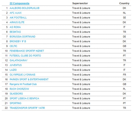 A lo largo de los últimos 10 años este índice experimentó numerosos cambios en los valores que lo componían debido a diversas razones como la bancarrota de algún equipo, su compra por parte de alguna compañía o inversor, la incorporación de clubes nuevos, etc. Actualmente componen este índice los siguientes 22 valores: