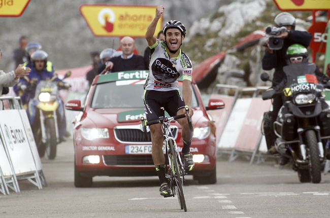 Juanjo Cobo cruzando la meta del Alto del Angliru. Ese día se puso el maillot de líder de la Vuelta
